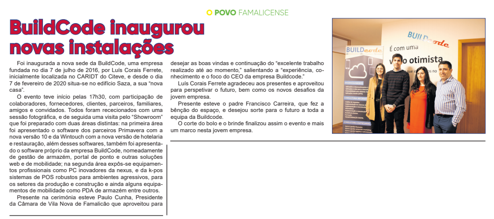 Foi inaugurada a nova sede da BuildCode, uma empresa fundada no dia 7 de julho de 2016, por Luís Corais Ferrete, inicialmente localizada no CARIDT do Citeve, e desde o dia 7 de fevereiro de 2020 situa-se no edifício Saza, a sua “nova casa”. O evento teve início pelas 17h30, com participação de colaboradores, fornecedores, clientes, parceiros, familiares, amigos e convidados. Todos foram rececionados com uma sessão fotográfica, e de seguida uma visita pelo “Showroom” que foi preparado com duas áreas distintas: na primeira área foi apresentado o software dos parceiros Primavera com a nova versão 10 e da Wintouch com a nova versão de hotelaria e restauração, além desses softwares, também foi apresentado o software próprio da empresa BuildCode, nomeadamente de gestão de armazém, portal de ponto e outras soluções web e de mobilidade; na segunda área expôs-se equipamentos profissionais como PC inovadores da nexus, e da k-pos sistemas de POS robustos para ambientes agressivos, para os setores da produção e construção e ainda alguns equipamentos de mobilidade como PDA de armazém entre outros. Presente na cerimónia esteve Paulo Cunha, Presidente da Câmara de Vila Nova de Famalicão que aproveitou para desejar as boas vindas e continuação do “excelente trabalho realizado até ao momento,” salientando a “experiência, conhecimento e o foco do CEO da empresa Buildcode. Luís Corais Ferrete agradeceu aos presentes e aproveitou para perspetivar o futuro, bem como os novos desafios da jovem empresa. Presente esteve o padre Francisco Carreira, que fez a bênção do espaço, e desejou sorte para o futuro a toda a equipa da Buildcode. O corte do bolo e o brinde finalizou assim o evento e mais um marco nesta jovem empresa.